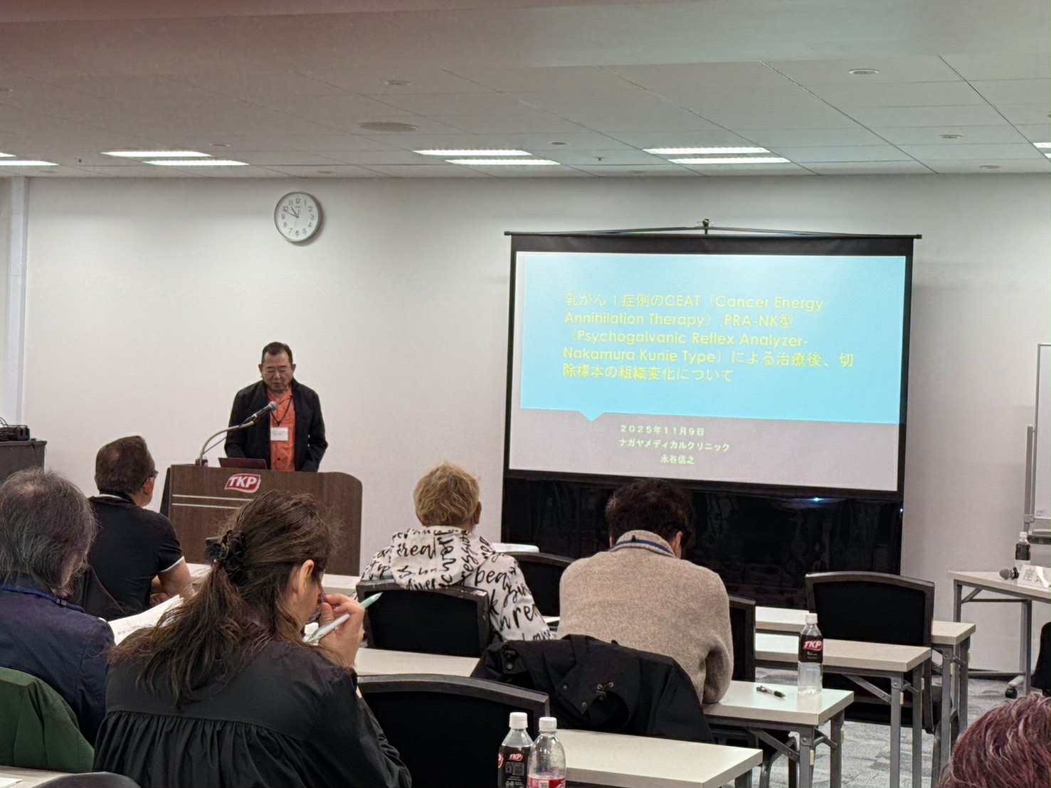 11月16日(土)CEAT学会創立10年の年次学術集会を品川の会場で開催いたしました。今年、前田華郎名誉理事長から引き継いだ新理事長の石井宏則先生(アドバンス・クリニック東京院長)による開会のご挨拶に続き、第1部の症例報告が行われました。午後の特別招待講演では、ノートルダム清心女子大学名誉教授で理学博士の保江邦夫先生をお迎えして、「量子電磁場の効能とその可能性」というテーマでお話しいただきました。携帯電話など身近な電磁波の話から専門的な知見まで、惜しみなく共有いただき、質疑応答も含め大変有意義な時間となりました。